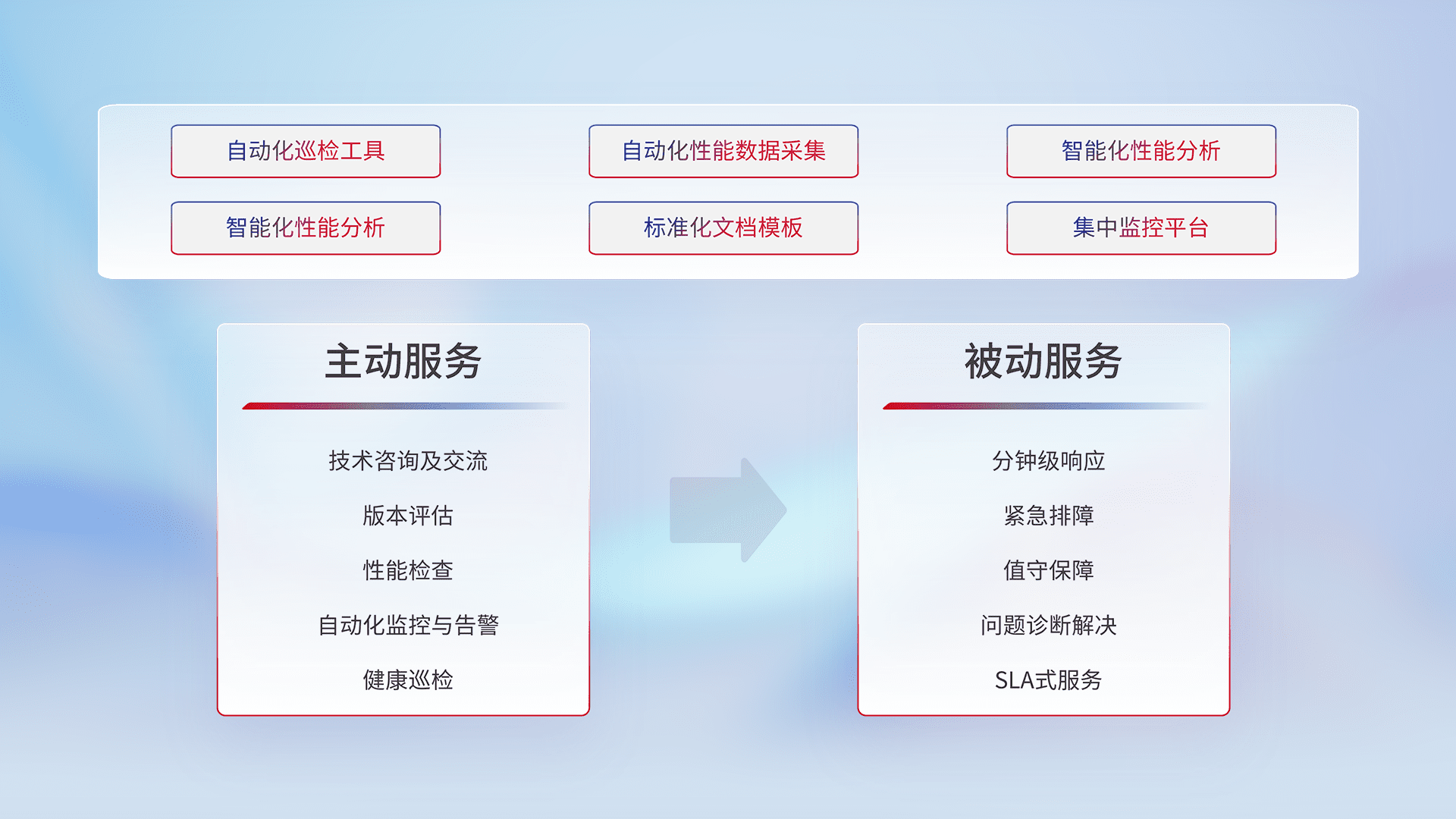 智能化工具和标准化文档,,保障服务质量,,提供主动服务(包含技术咨询、、版本评估、、、、性能检查、、、、自动化监控与告警、、、、健康巡检)和被动服务包含(分钟级响应、、、紧急排障、、、、值守保障、、、问题诊断解决、、、SLA服务)。。